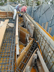 屋根の型枠が完了後、鉄筋を施工している様子。