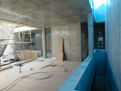 コンクリート打設前の型枠工事が完了した様子。奥の壁には、2階との吹抜けを通して自然光が射している。